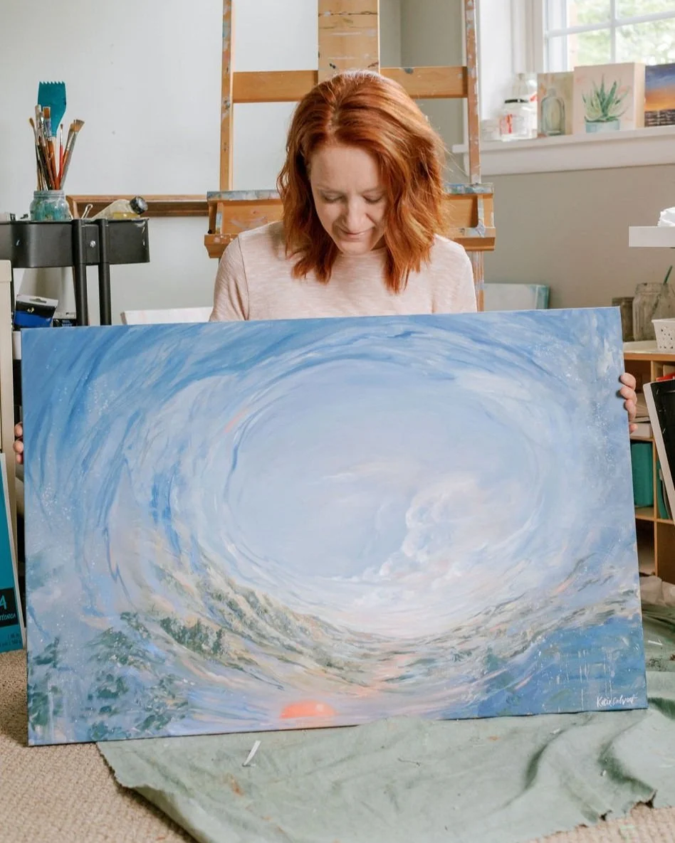 I began this oil painting with excitement to share the sense of wonder of the very moment that the bright presence of Jesus replaces the sun. The painting conveys this moment from the sun’s perspective, as you see it about to fade from view in the bottom left. The sun “takes a final bow”, as it were, settling his last glorious sunset and in humility, with the rest of creation, looking on towards the horizon. The painting as a whole is heavily circular, with strands of light, clouds, and stars painted in a swirling momentum, to express all of creation as a song, being beckoned with the sun’s last rays to stream towards the New. This is the moment for which all of creation has eagerly longed for: the original Song that created the world is finally about to come back together. There are cedars, representing those planted “in the house of the Lord” in verse 12, clothed with joy and waiting for the new Light.